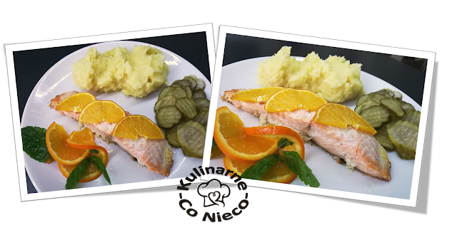 i piec łososia przez 1 h. Tak upieczoną rybę podawać na ciepło z puree