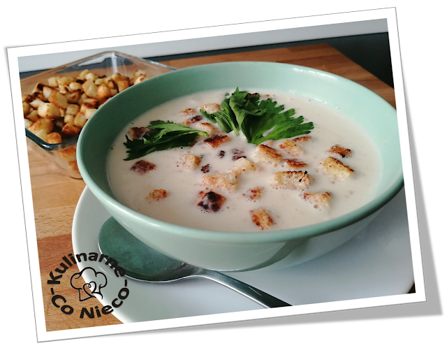 Zupę podawać na ciepło posypaną garścią usmażonych grzanek.