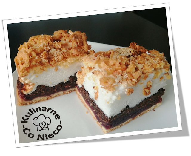 Kolejnym elementem jest kakaowa warstwa kruchego ciasta, która nadaje całości głębi i delikatnej czekoladowej nuty. A na wierzchu pojawia się lekka, puszysta beza, która podczas pieczenia tworzy charakterystyczną, lekko chrupiącą skorupkę. W środku pozostaje miękka i subtelna, dzięki czemu każdy kęs jest jednocześnie kruchy, wilgotny i lekko piankowy.