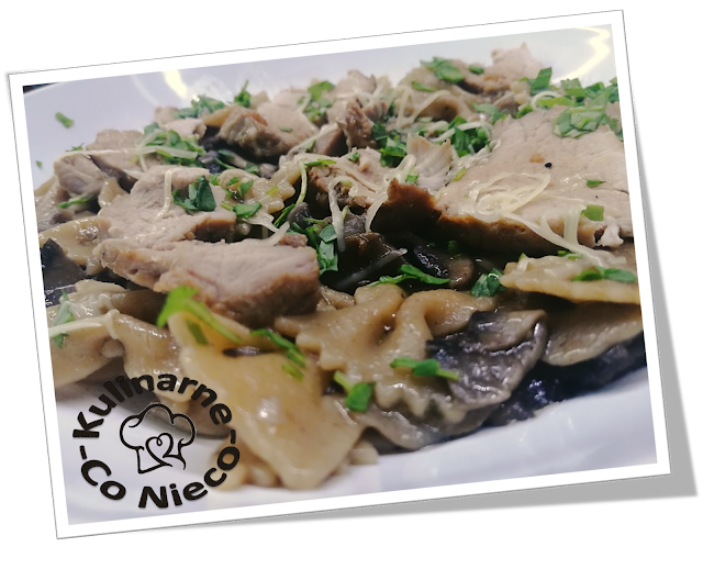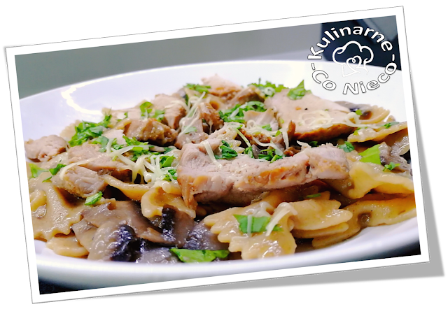 polędwicy, zdrowy, pełnoziarnisty makaron i pieczarki tworzą razem doskonałą