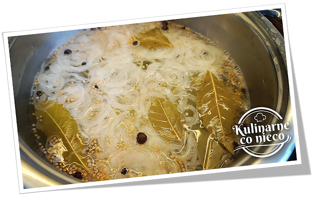 W garnku zagotować 1 litr wody z cukrem, solą oraz przyprawami (liście laurowe, ziele angielskie, pieprz, gorczycę). Dodać pokrojoną cebulę i gotować całość przez 5 minut na małym ogniu. Następnie dodać ocet i całość ponownie doprowadzić do wrzenia i zdjąć z ognia.