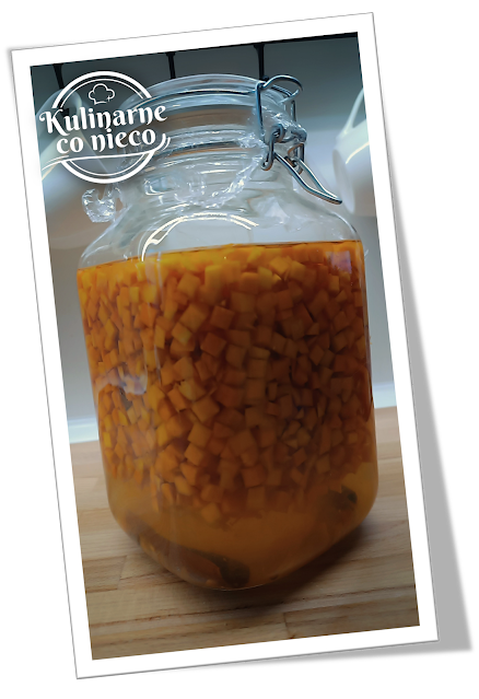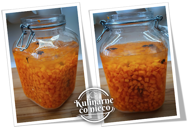 dużego, szczelnego słoja włożyć pokrojoną dynię. Dodać cynamon, goździki, anyż,