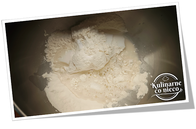 do miski, dodać sól i proszek do pieczenia, smalec i wlać wodę.