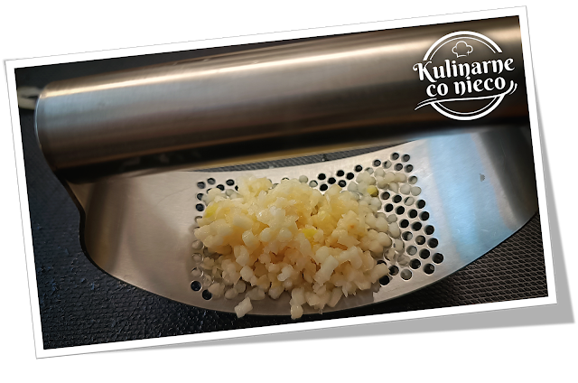 posiekać w drobną kostkę, a czosnek przecisnąć przez praskę lub zetrzeć na