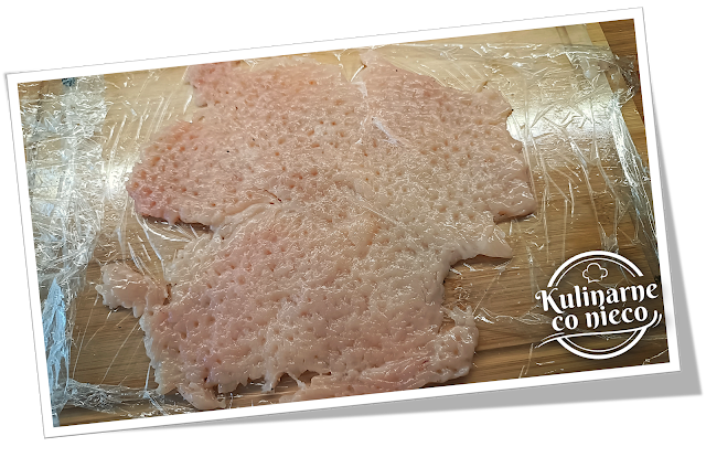 z kurczaka oczyścić, osuszyć i rozbić przez folię spożywczą na cienkie, równe