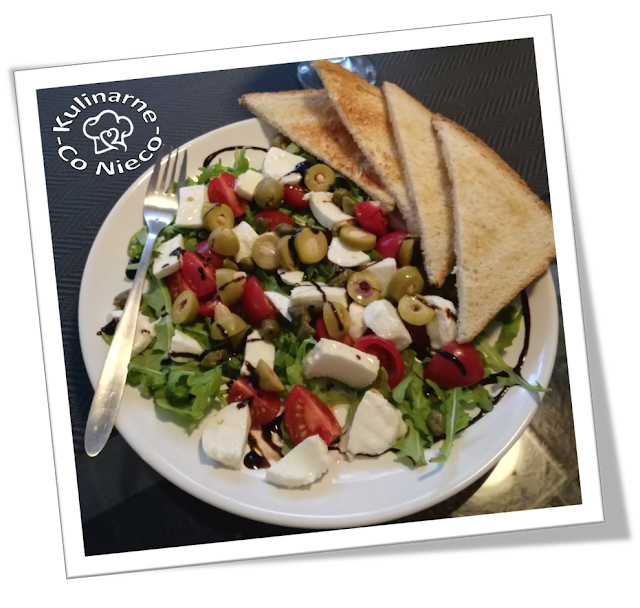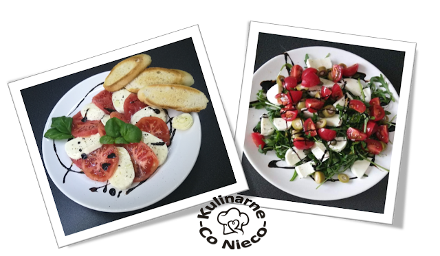 małymi kaparami oraz pokrojonymi w plasterki oliwkami i pomidorkami. Mozzarellę