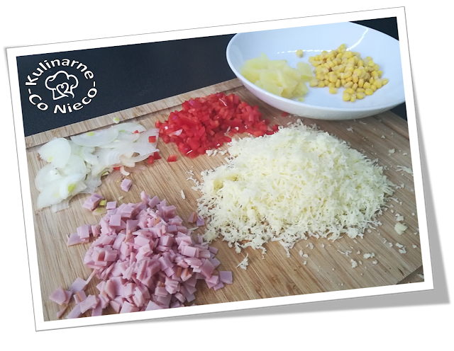 w kostkę. Cebulę pokroić w piórka a kawałki ananasa na mniejsze cząstki. Ser
