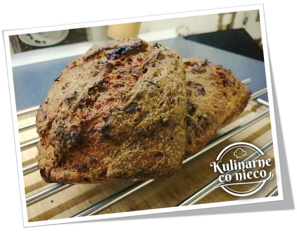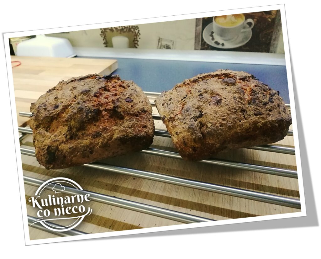 Gdy naczynie będą już bardzo gorące, przelać ciasto z miski do naczynia. Całość wstawić z powrotem do piekarnika i piec bez przykrycia przez 5 minut, następnie przykryć naczynie pokrywą i piec przez 25 minut. Po upływie 25 minut zdjąć pokrywę i piec chleb jeszcze przez kolejne 20 minut (gdyby wierzch chleba za mocno się przyrumieniał należy nakryć go kawałkiem filii aluminiowej). Wyjąć chleb z piekarnika. Po ok 15 minutach delikatnie wyjąć z naczynia i studzić na kratce.