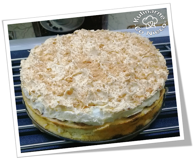 Sernik wyjąć z piekarnika i szybciutko ułożyć bezę na jego