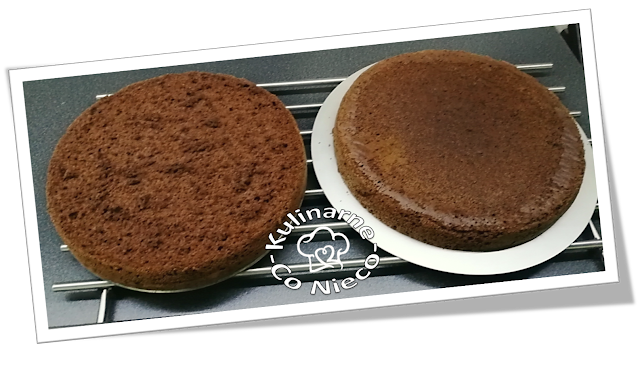 przygotowany biszkopt podzielić na dwa równe blaty przy użyciu ostrego noża.