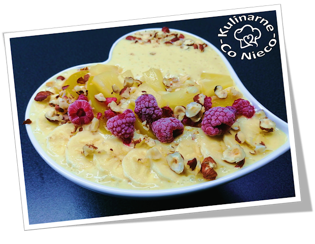 Koktajl przelać do miseczki a następnie udekorować owocami i