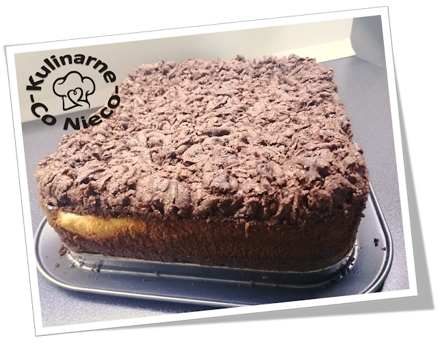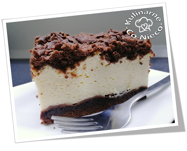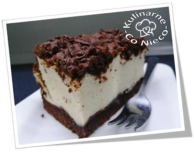warstw kakaowego ciasta kruchego – na spodzie oraz (startego) na wierzchu. Sernik