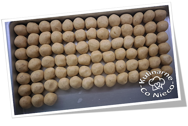równe kuli wielkości orzecha laskowego w łupie po ok 7 g każda. Gotowe kuleczki