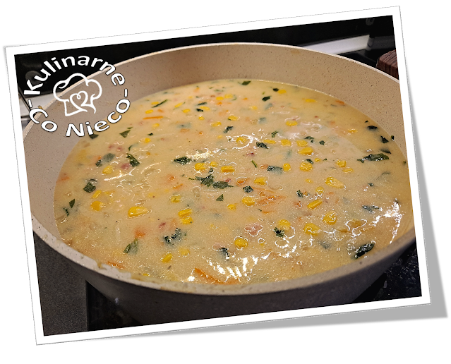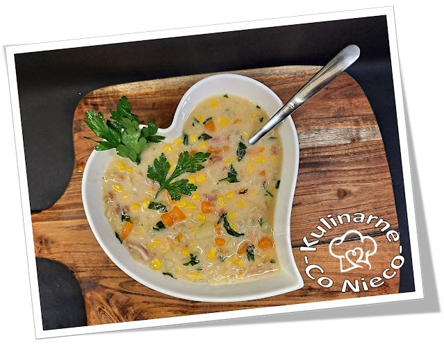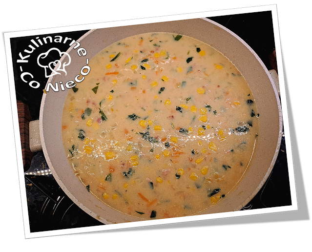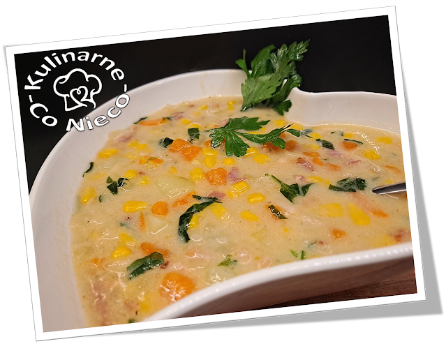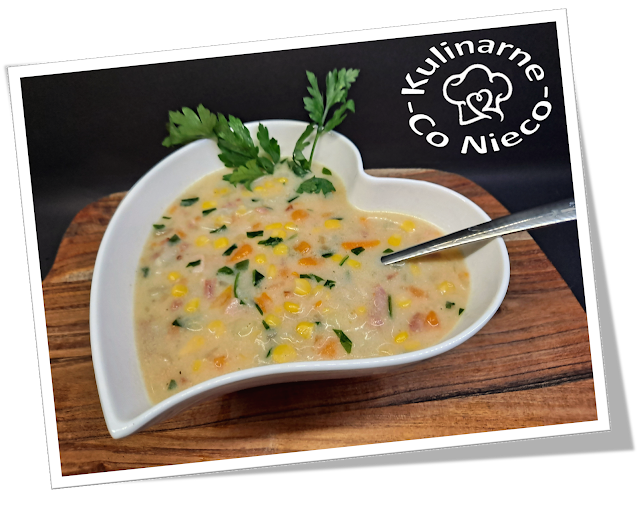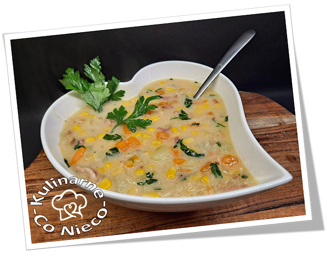 i sycąca zupa kukurydziana zawiera w sobie słodką kukurydzę, chrupiący boczek a