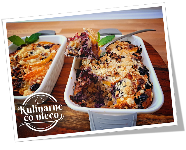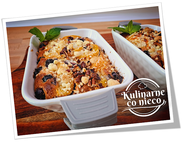udekorować jagodami, pokrojonymi w plastry brzoskwiniami. Posypać kruszonką i