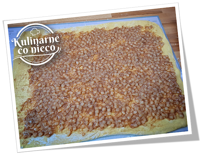 rozprowadzić nadzienie jabłkowe a następnie zwinąć ciasto względem krótszego boku