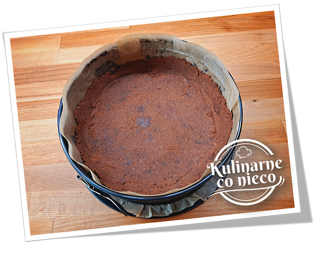 wyłożyć dno i lekko boki tortownicy a następnie ugnieść dłonią lub łyżką.
