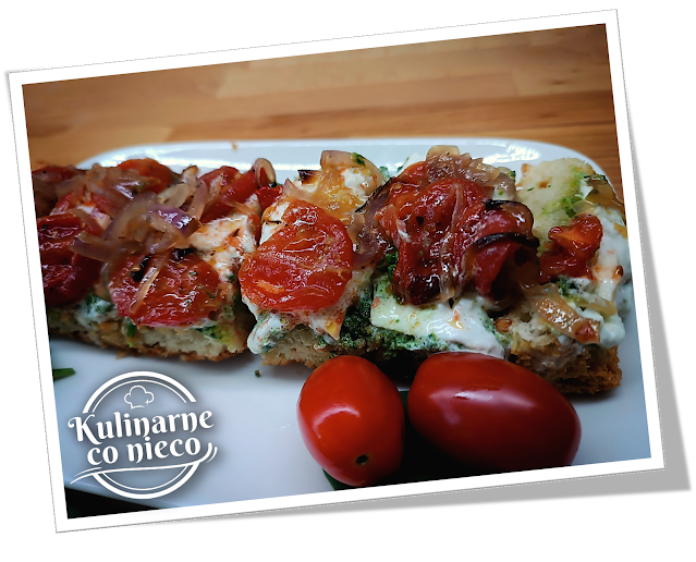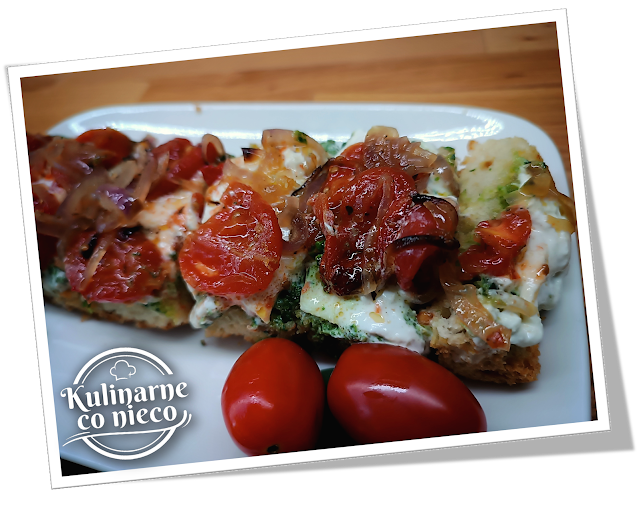 pomidorkami i karmelizowaną cebulką.