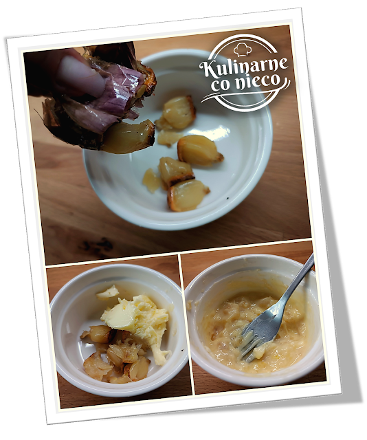 wycisnąć delikatnie upieczony czosnek do niewielkiej miseczki i dodać do niego