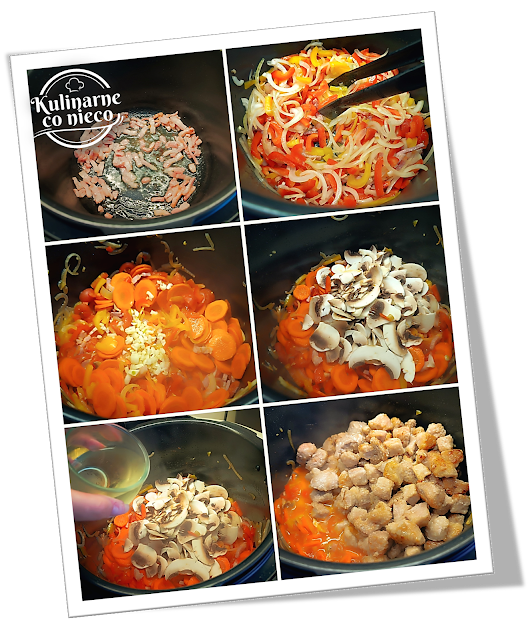 dodać cebulę i obie papryki. Podsmażać całość przez 5 minut często mieszając.