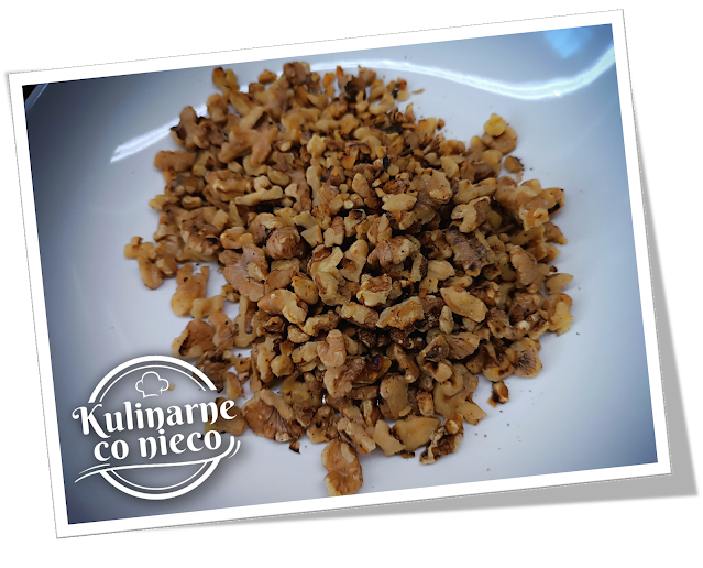 Orzechy drobno posiekać i podprażyć na suchej patelni.