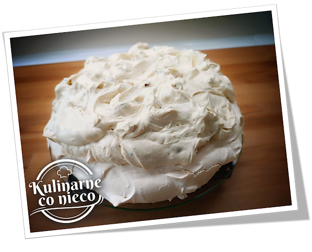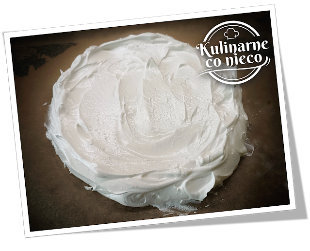 paterze ułożyć pierwszy z blatów bezy (ten gładki). Na blacie ułożyć krem i