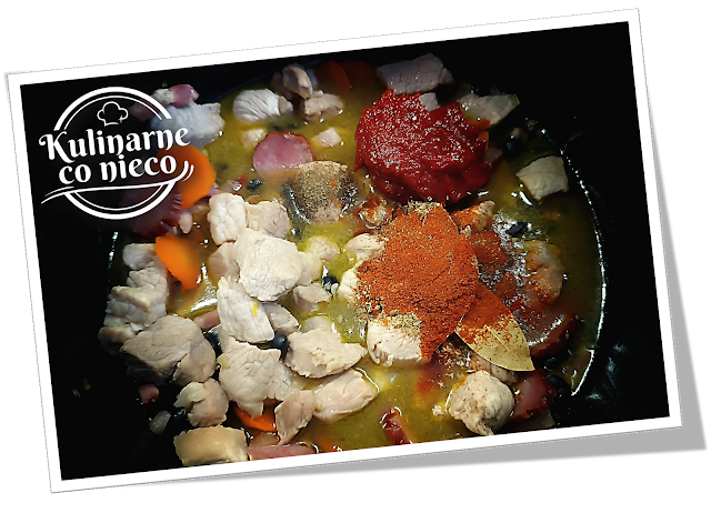 wszystkie przyprawy oraz koncentrat pomidorowy, wymieszać. Doprowadzić całość do