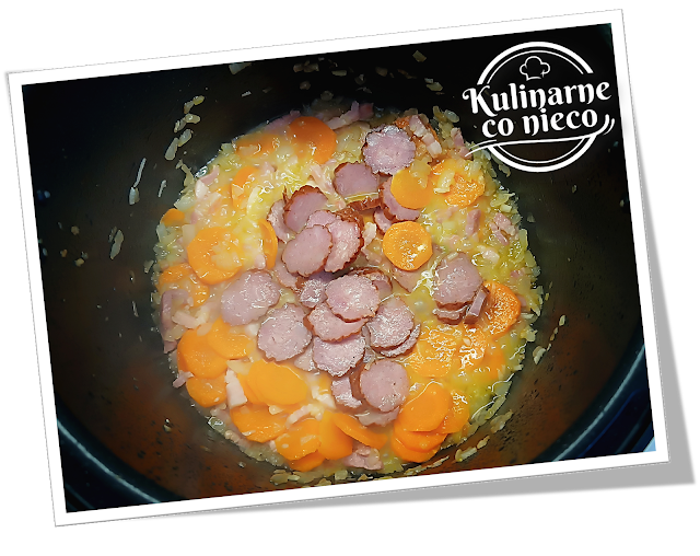 posiekany czosnek, podsmażać 3 min. Dodać pokrojona kiełbasę, wymieszać i