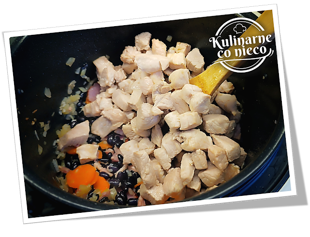 podsmażać następne 3 min często mieszając. Dodać fasolę, wymieszać i dusić 3