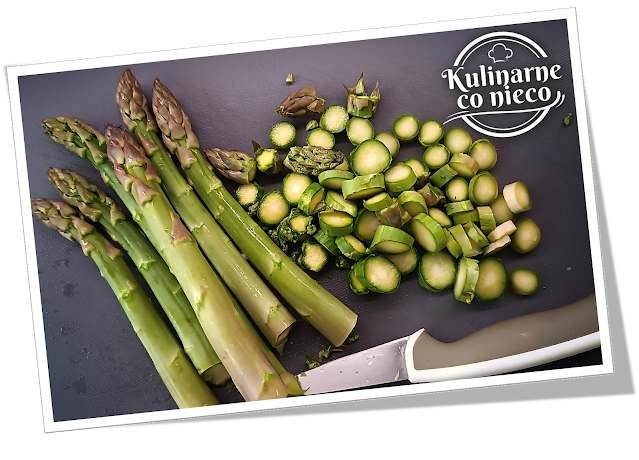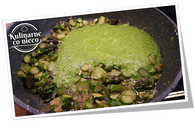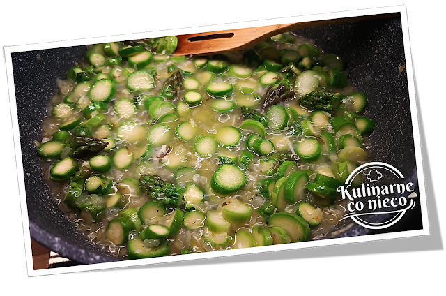 dodać pokrojone szparagi i dusić całość przez ok 5 min. Całość