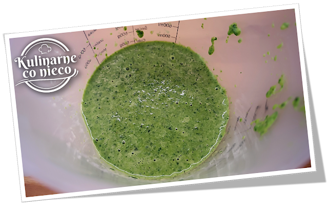 wysokiego pojemnika włożyć szpinak, dodać ok ½ szklaki wody z ugotowanego makaronu,