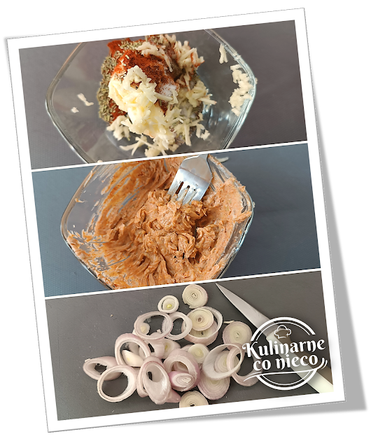 przez praskę lub bardzo drobno posiekany czosnek. Wymieszać. Cebulę obrać i pokroić w talarki.