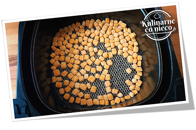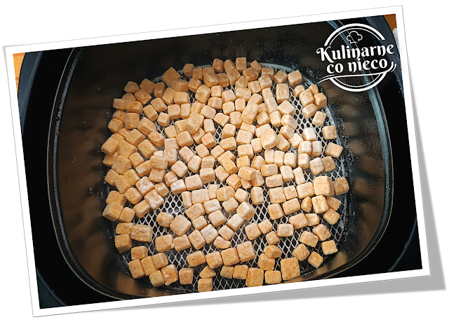 AirFryera spryskać oliwą i umieścić w nim wypanierowane kostki tofu. Wsunąć