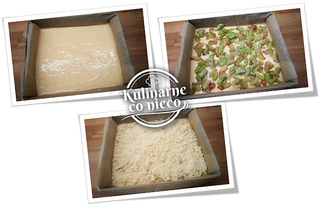 Na wierzchu ułożyć pokrojony rabarbar i zasypać go schłodzona kruszonką.