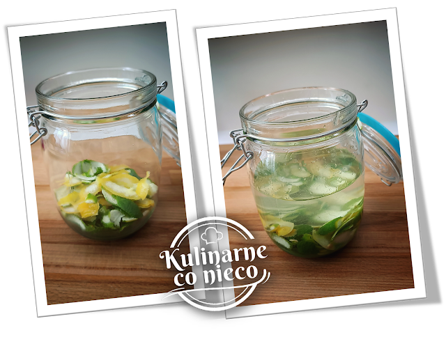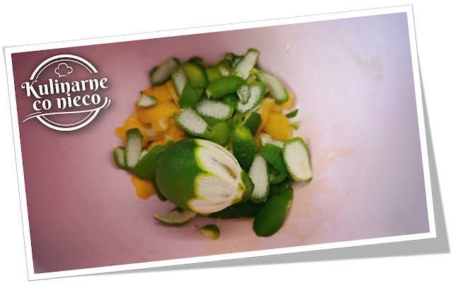 W pierwszej kolejności należy wybrać dojrzałe i mocno zielone limonki oraz dość duże, jędrne o grubej skórce cytryny najlepiej z upraw ekologicznych. Następnie zarówno limonki jak i cytryny należy bardzo dokładnie umyć. Po umyciu zalać je wrzątkiem i sparzać przez 30 sekund. Wyparzone owoce osuszyć i używając noża z ostrym ostrzem lub obieraczki do warzyw obrać wszystkie limonki i cytryny. Ze skórek usunąć całą białą część (można to zrobić wycinając ją ostrym nożem lub otrzeć na tarce).