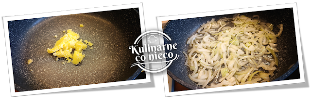 dużej patelni rozgrzać 3 łyżki klarowanego masła. Na maśle zeszklić cebule.