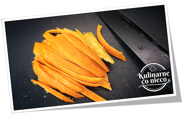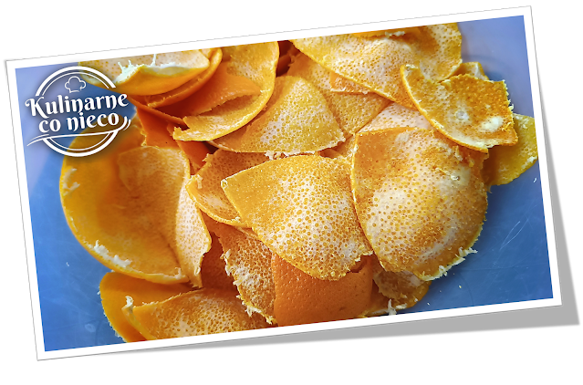 Wyparzone pomarańcze osuszyć i używając noża z ostrym ostrzem lub obieraczki do warzyw obrać wszystkie pomarańcze. Ze skórek usunąć całą białą część (można to zrobić wycinając ją ostrym nożem lub otrzeć na tarce na drobnych oczkach). Skórki pokroić na małe paski.