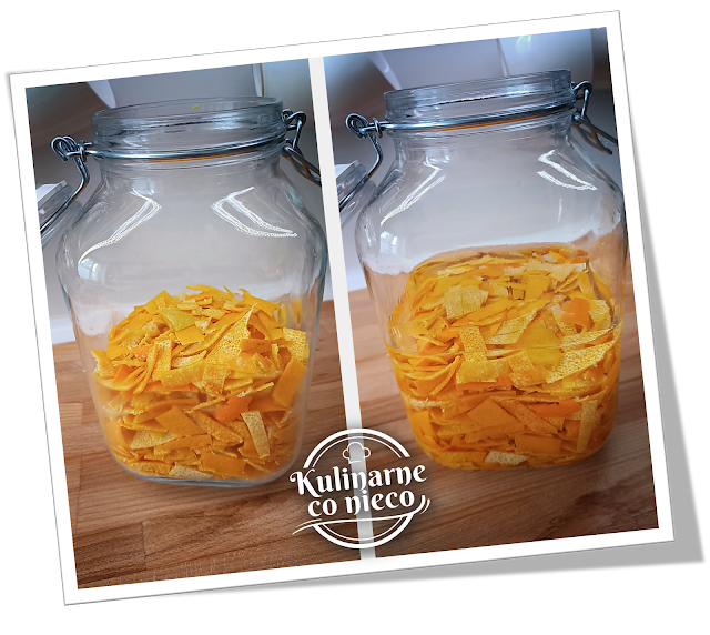 Skórki włożyć do słoika i zalać spirytusem. Słoik szczelnie zakręcić i odstawić w chłodne oraz ciemne miejsce na min 3 tygodnie. Co kilka dni potrząsnąć słoikiem.