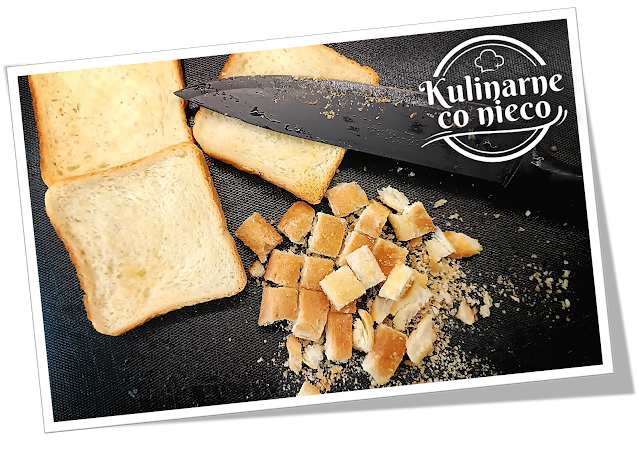 pokroić na małe kostki i na łyżce klarowanego masła uprażyć je na złoty kolor. Tosty