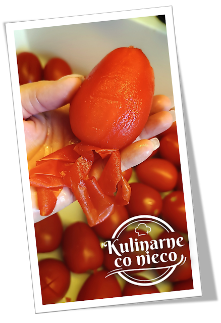 miski z zimną wodą. Po chwili ściągnąć skórki z pomidorów.