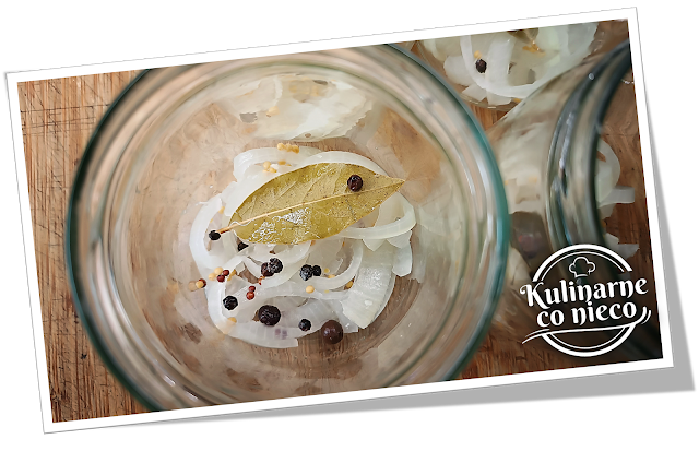 francuską, pokrojoną w piórka cebulę, liście laurowe, ziele angielskie, ziarna pieprzu