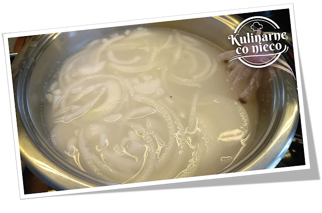 przecedzić przez sitko i pozostałą na sitku cebulę oraz przyprawy rozdzielić po