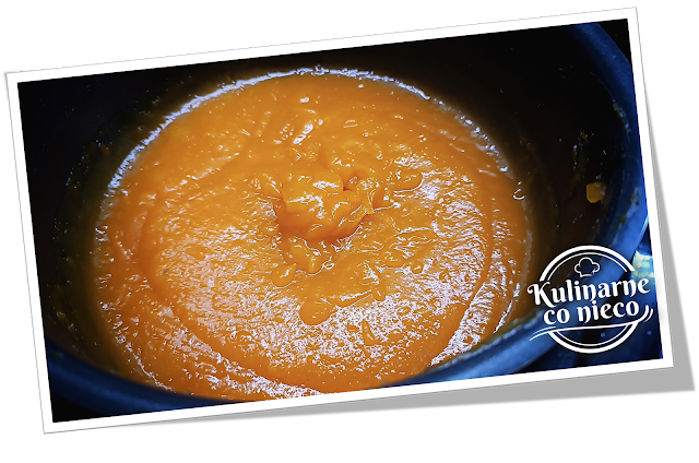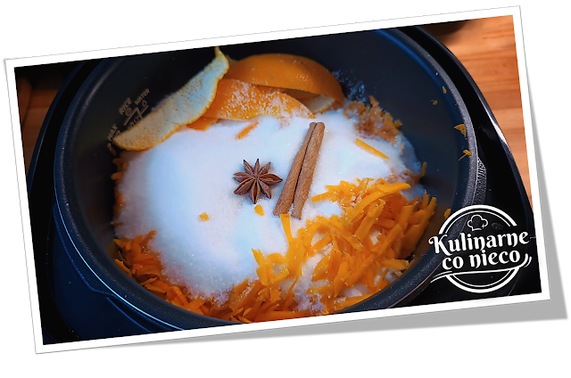 proces się zakończy ostrożnie otworzyć pokrywę. Usunąć laskę cynamony, gwiazdkę anyżu oraz ugotowane skórki z pomarańczy a następnie całość zblendować blenderem ręcznym typu żyrafa na gładki mus.