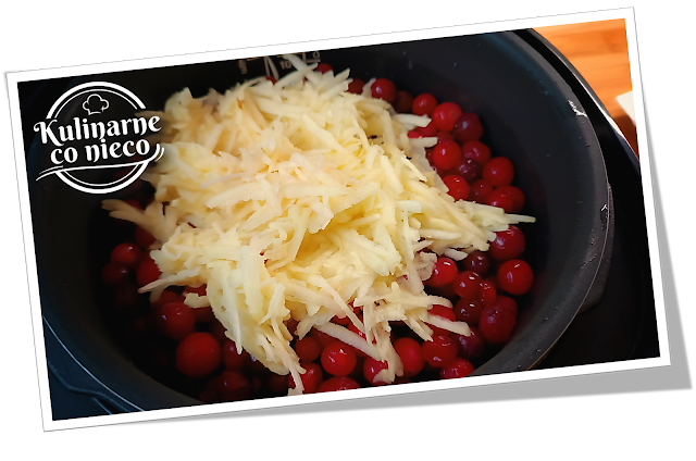 żurawinę umieścić w misie Multicookera. Dodać starte jabłka, cukier, wodę i sok z