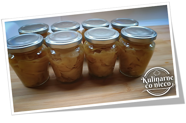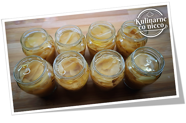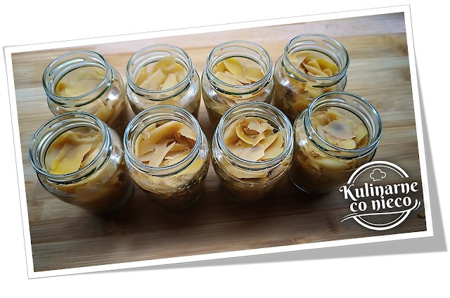 Przygotować ok 8 słoików o pojemności ok 130 ml. Słoiki oraz nakrętki umyć, wyparzyć wrzątkiem i osuszyć.