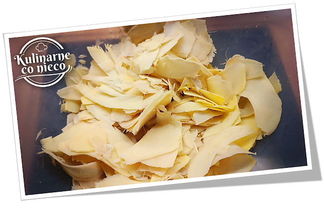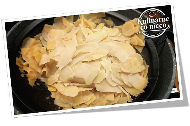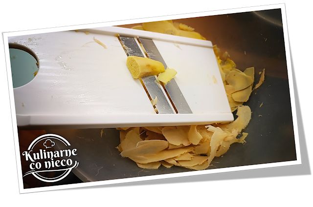 Imbir cienko obrać, co najlepiej wykonać przy pomocy łyżki lub noża, aby zminimalizować utratę miąższu. Następnie imbir pokroić na bardzo cienkie plasterki – idealnym narzędziem jest obieraczka do warzyw lub mandolina, które pozwolą uzyskać jednolitą grubość. Cienkie plasterki lepiej wchłaniają smaki marynaty i szybciej się nią nasączają, co poprawi teksturę gotowego produktu.