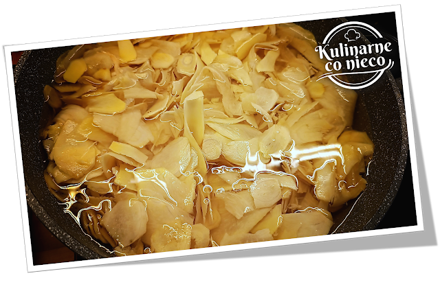 W dużym garnku zagotować ok 1½ litra wody, a następnie wrzucić do niej plasterki imbiru i gotować je przez około 5 minuty. Blanszowanie zmiękcza imbir, dzięki czemu łatwiej wchłonie on potem aromat marynaty.