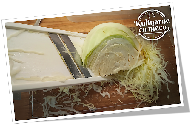 Kapustę umyć, pokroić na ćwiartki i drobno poszatkować ostrym nożem lub przy pomocy mandoliny do warzyw.