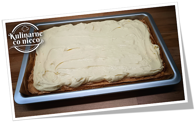 nabierze złotego koloru. Po upieczeniu ciasto wyjąc na blat i pozostawić do ostygnięcia. Przygotować krem.