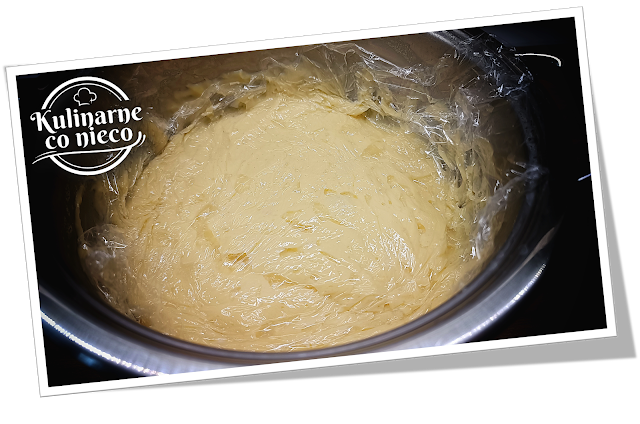 Zdjąć z gazu i przykryć wierzch masy budyniowej folią spożywczą w tzw.: kontakcie, aby zapobiec utworzeniu się kożucha. Garnek z budyniem odstawić do całkowitego ostygnięcia.